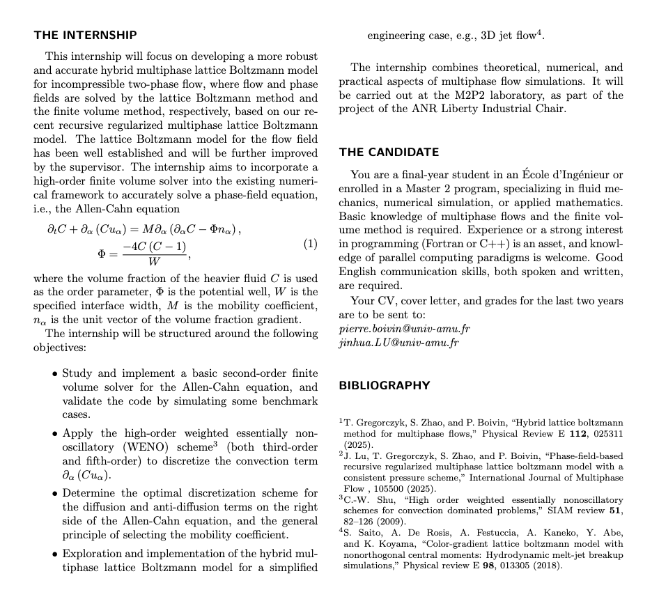 You are a final-year student in an Ecole d’Ingénieur or enrolled in a Master 2 program, specializing in fluid mechanics, numerical simulation, or applied mathematics. Basic knowledge of multiphase flows and the finite volume method is required. Experience or a strong interest in programming (Fortran or C++) is an asset, and knowledge of parallel computing paradigms is welcome. Good English communication skills, both spoken and written, are required.