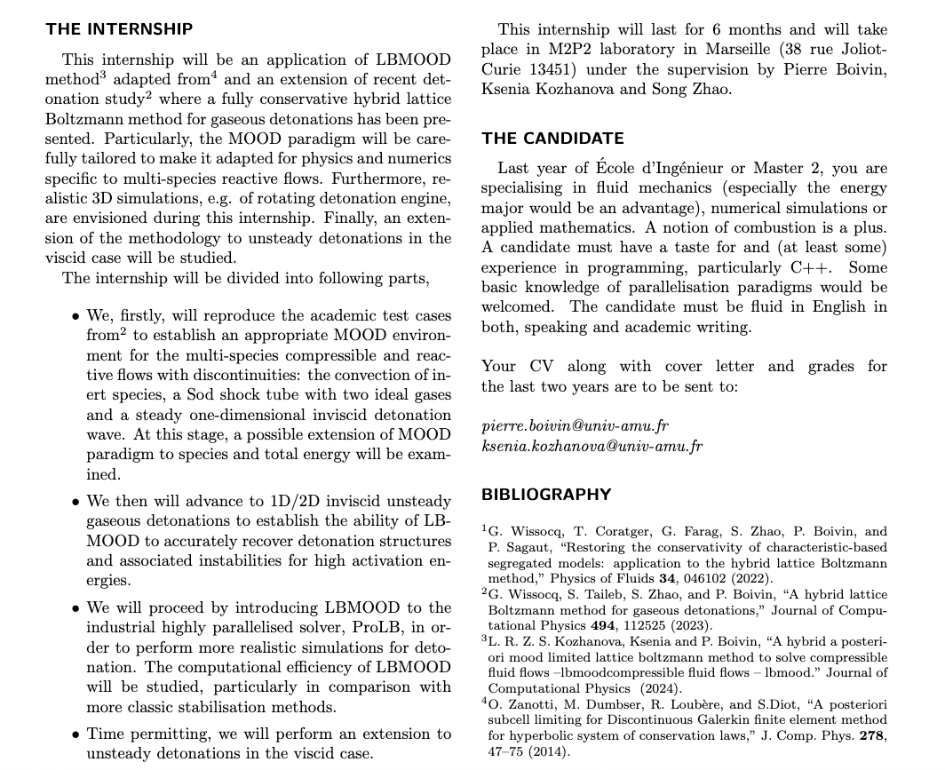 Last year of Ecole d’Ingénieur or Master 2, you are specialising in fluid mechanics (especially the energy major would be an advantage), numerical simulations or applied mathematics. A notion of combustion is a plus. The candidate must have a taste for and (at least some) experience in programming, particularly C++. Some basic knowledge of parallelisation paradigms would be welcomed. The candidate must be fluid in English in both, speaking and academic writing.